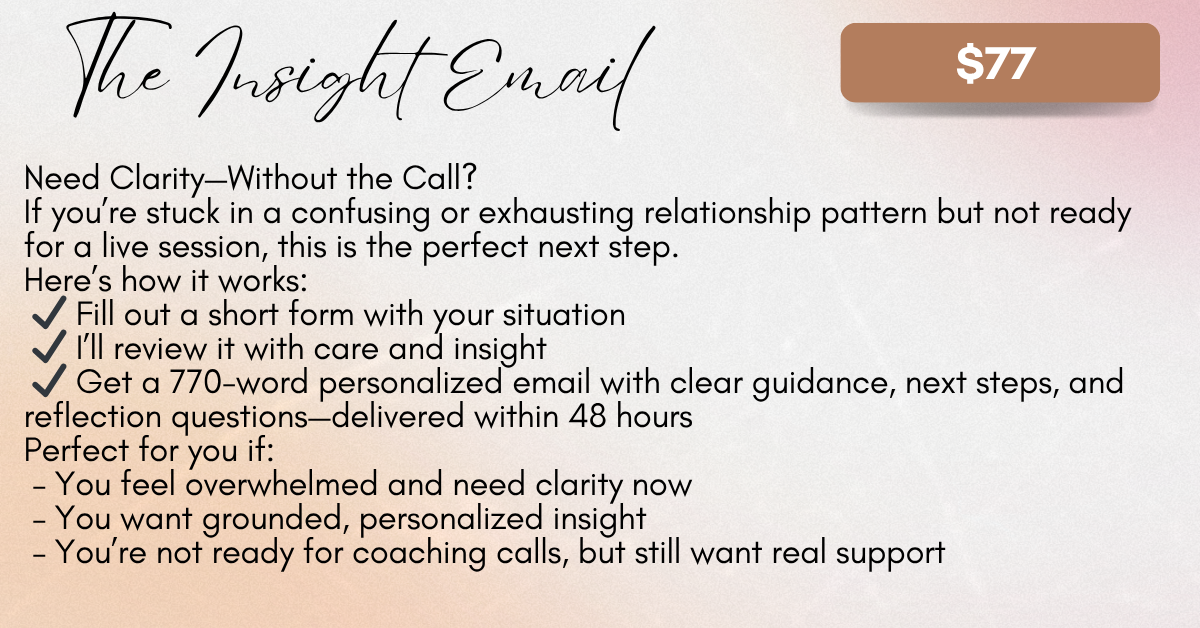 For just $77, you’ll receive a tailored 770-word coaching response—crafted by me personally—based on your unique situation. Whether you're feeling stuck, overwhelmed, or at a crossroads in your relationship or inner world, this is your chance to get clear, aligned, and back in your power.